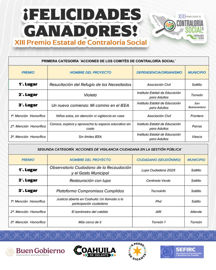 EL PRIMER LUGAR DE CADA CATEGORÍA DE ESTA ETAPA, REPRESENTARÁ AL ESTADO DE COAHUILA EN LA XVI EDICIÓN DEL PREMIO NACIONAL DE CONTRALORÍA SOCIAL.