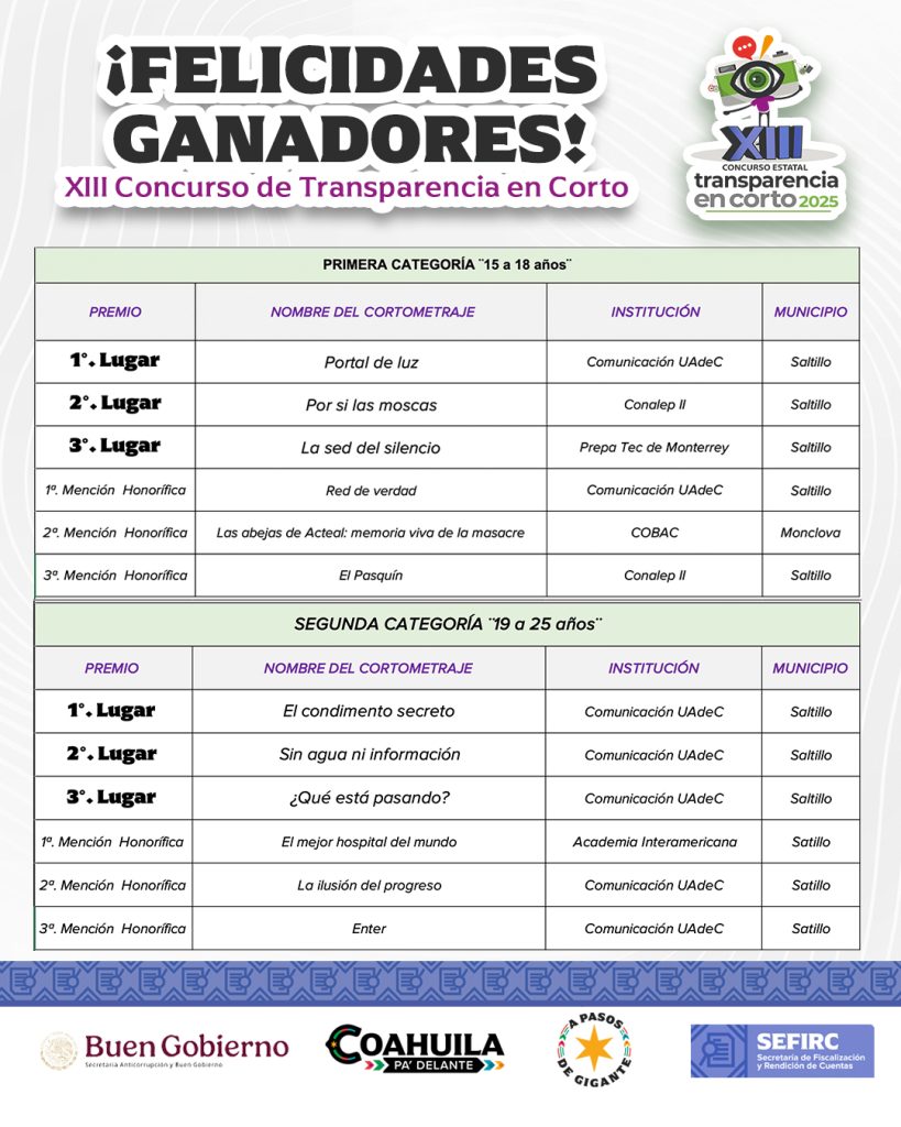 | LOS TRES PRIMEROS LUGARES DE CADA CATEGORIA REPRESENTARÁ AL ESTADO DE COAHUILA EN LA XX EDICIÓN DEL CONCURSO NACIONAL DE TRANSPARENCIA EN CORTO |